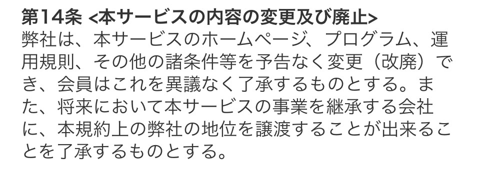 弊社は、本サービスのホームページ、プログラム、運用規則、その他の諸条件等を予告なく変更(改廃)でき、会員はこれを意義無く了承するものとする。また、将来において本サービスのへの事業を継承する会社に、本規約上の弊社の地位を譲渡することが出来ることを了承するものとする。