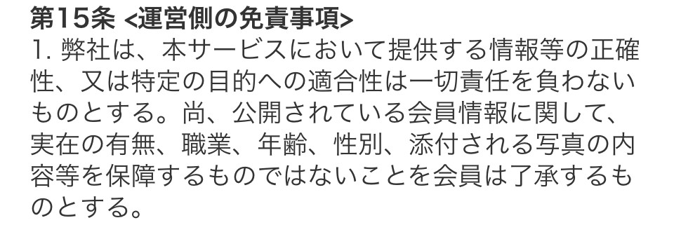 尚、公開されている会員情報に関して、実在の有無、職業、年齢、性別、添付される写真の内容等を保証するものではないことを会員は了承するものとする。