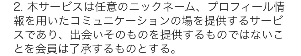 2.本サービスは任意のニックネーム、プロフィール情報を用いたコミュニケーションの場を提供するサービスであり、出会いそのものを提供するものではないことを会員は了承するものとする。