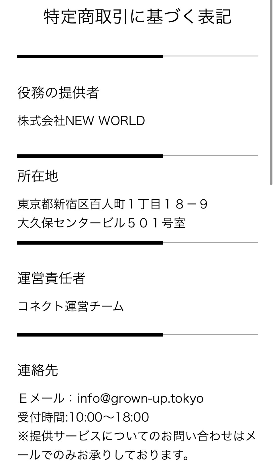 アプラボ!が調査した結果、「コネクト」の特定商取引法の表記は限りなく怪しいものになっています。