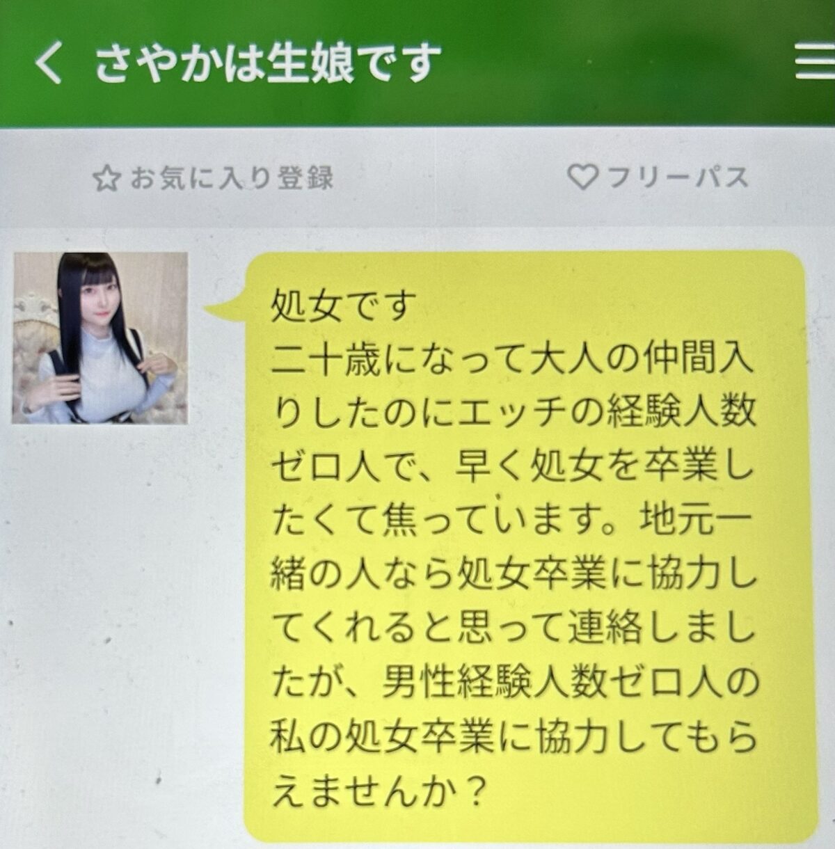 二十歳になって大人の仲間入りしたのにエッチの経験人数ゼロ人で、早く処女を卒業したくて焦っています。地元一緒の人なら処女卒業に協力してくれると思って連絡しましたが、男性経験人数ゼロ人の私の処女卒業に協力してもらえませんか?