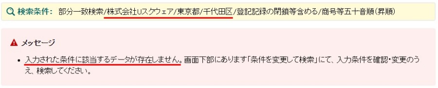 このように、「株式会社Uスクウェア」はサイト内の特商法ページに記載されている「東京都千代田区」の住所で法人として登録されている情報は確認できませんでした。