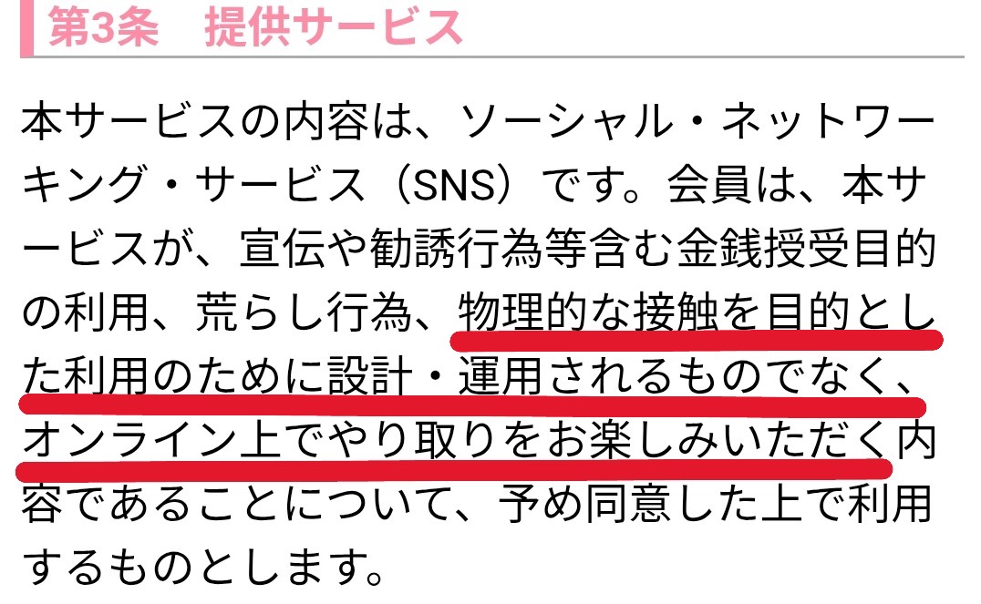 2.本サービスは、ソーシャル・ネットワーキング・サービス(SNS)です。会員は、本サービスが、宣伝や勧誘行為等含む金銭授受目的の利用、荒らし行為、物理的な接触を目的とした利用のために設計・運用されるものでなく、オンライン上でやり取りをお楽しみいただく内容であることについて、予め同意した上で利用するものとします。