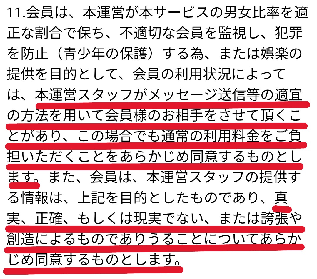 11.会員は、本運営が本サービスの男女比率を適正な割合で保ち、不適切な会員を監視し、犯罪を防止(青少年の保護)する為、または娯楽の提供を目的として、会員の利用状況によっては、本運営のスタッフがメッセージ送信等の適宜の方法を用いて会員様のお相手をさせていただくことがあり、この場合でも通常の利用料金をご負担いただくことをあらかじめ同意するものとします。また、会員は、本運営スタッフの提供する情報は、上記を目的としたものであり、真実、正確、もしくは現実でない、または誇張や創造によるものでありうることについてあらかじめ同意するものとします。