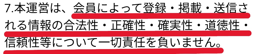 7.本運営は、会員によって登録・掲載・送信される情報の合法性・正確性・確実性・道徳性・信頼性について一切責任を負いません。