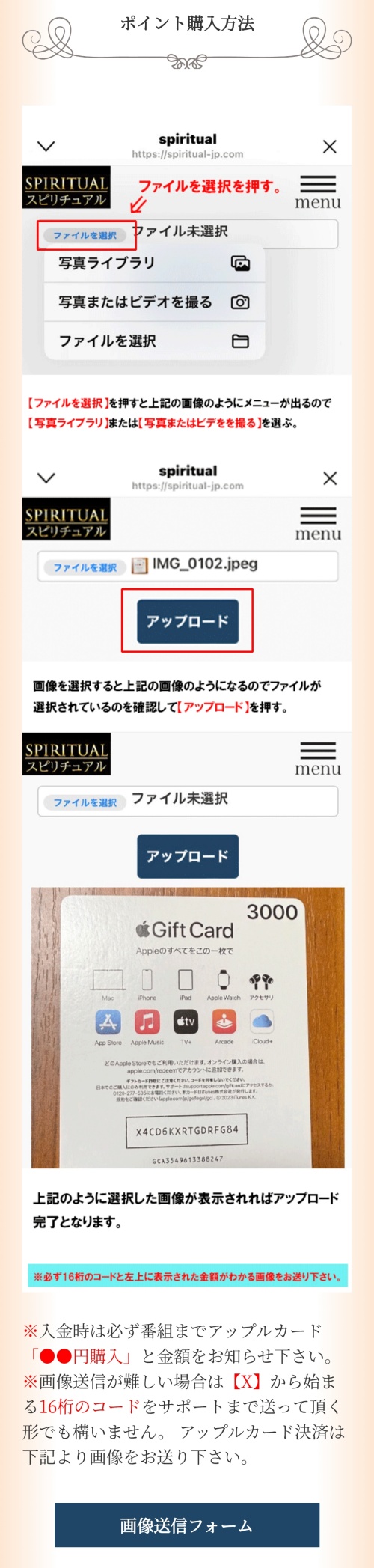 - アップルギフトカードのコードを送らせる、または写真(画像)を送らせる方法