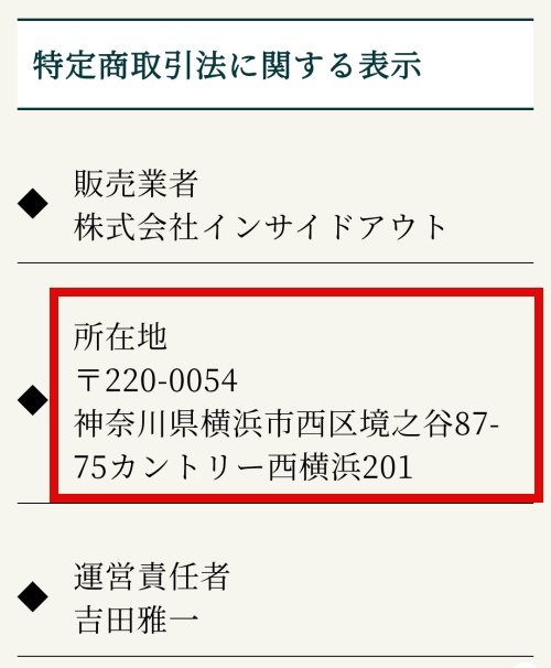 現在、サイト内の特商法ページには、所在地が「神奈川県横浜市西区境之谷87-75カントリー西横浜201」と記載されています。