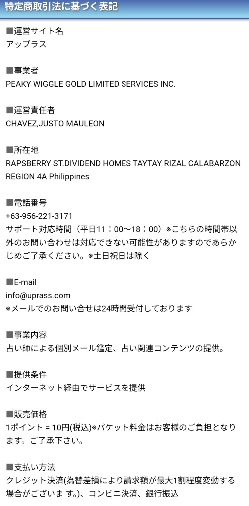 「アップラス」(UPRAS/あっぷらす)は【所在地が海外(フィリピン)に設定されている運営会社】が運営する占いサイトです。